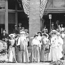 Roseburg ladies street cleanup, with Roseburg Orchestra. ca. 1910. Clara Park to right of drum. DCM orig. (2 copies) Mose Rice is second from right in back row [holding broom, wearing hat and smoking cigar]. Jessie Buell Rice, his wife, is standing in second row right center [behind 2 women with hats, in front of brick column].; Identification of Mose and Jessie Buell Rice provided by Phyllis Buell Paroz. OBJECT DATE:June 10, 1908 Newspaper article describing the Clean-up Day |